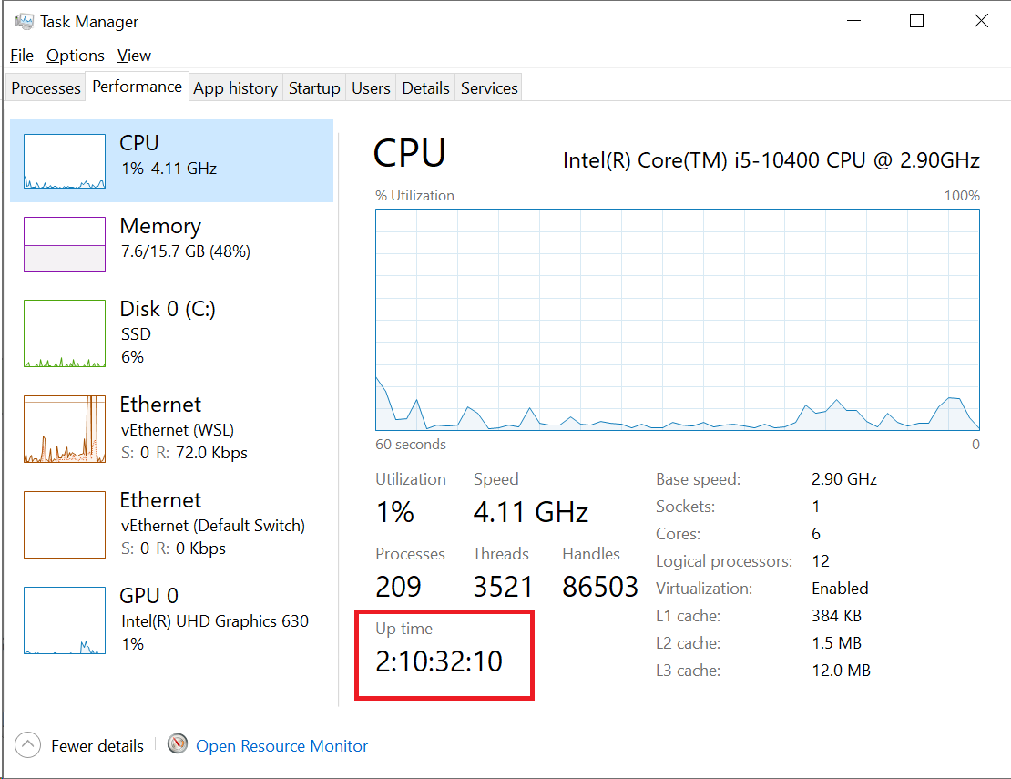 작업 관리자 실행(Ctrl + Shift + ESC) -> Performance tab -> CPU Section? -> arround bottom